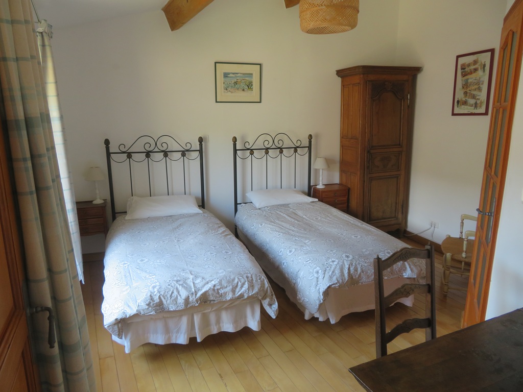On accède ensuite à l’étage supérieur pour découvrir deux belles chambres, avec une vue encore plus étoffée sur les collines, et notamment sur le roc de Cagalière. L’une possède un grand lit (éventuellement divisible) et l’autre deux lits simples, chacune disposant par ailleurs de sa salle d’eau complète. C’est ainsi la première configuration possible, bien adaptée jusqu’à quatre personnes.